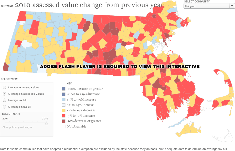Very nice info graphic and visualization tool which shows (yikes) both the tax rates for each town and also the change in assessed home values. It definitely shows the drop in value that occurred in Central Mass and some other regions where a simple house can now be purchased for under 100k.